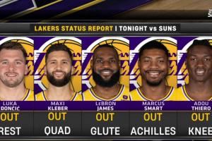 缺阵理由:东契奇休息、克莱伯四头肌、詹姆斯臀大肌受伤、斯玛特跟腱、阿杜膝盖