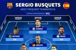 德转评布斯克茨最常搭档11人阵容:梅西639场第1,皮克605场第2