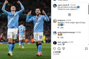 体育资讯11月3日讯 2025-26赛季英超第10轮,曼城3-1战胜伯恩茅斯。赛后,本场比赛送出2次助攻的谢尔基在社交媒体庆祝球队获胜。