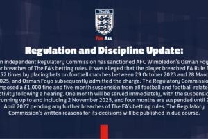 独立监管委员会已对AFC温布尔登球员奥斯曼-福约违反博彩条例的行为作出处罚。据指控,该球员在2023年10月29日至2025年3月28日期间对足球比赛进行投注,违反英足总E8条例252次。